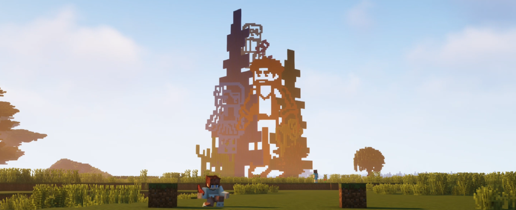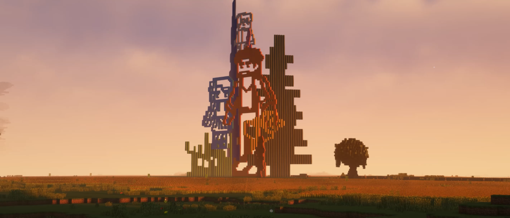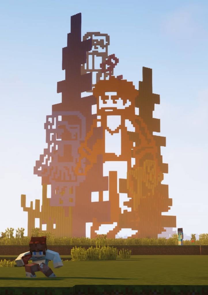 作品灵感来自像素游戏对万物的概括方式: 山、石、草、木被简化为一个个方格单元,在这座钢铁公园中重新唤醒朴拙的生机。雕塑投下的影子不再是纯粹的树与花,而是几何的叠影,仿佛方块的棱角在光线中微微松动,生出几分草木的姿态。在数字的秩序之下,依然藏着一层属于自然的生长底色。