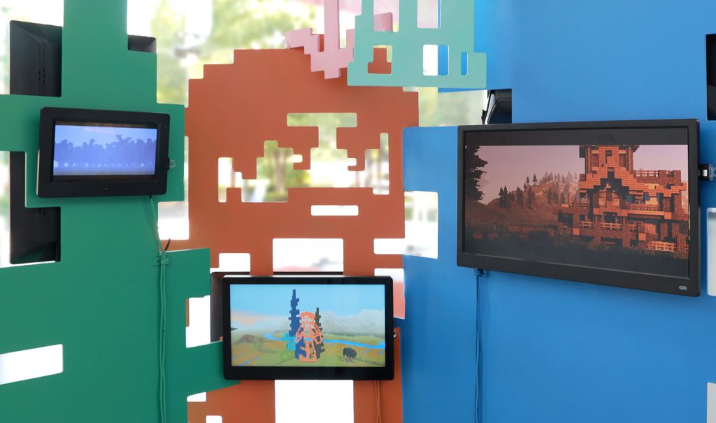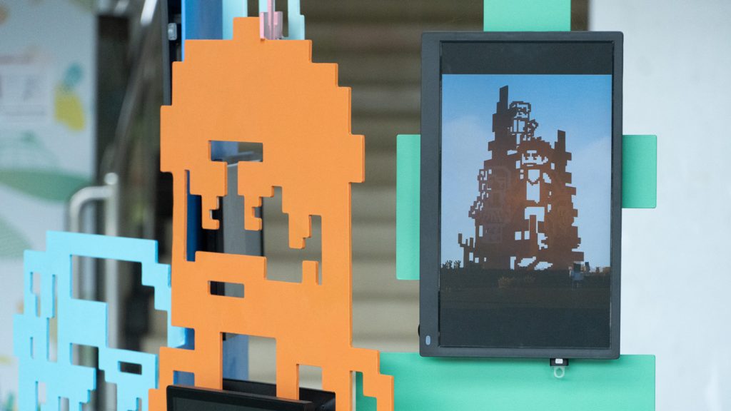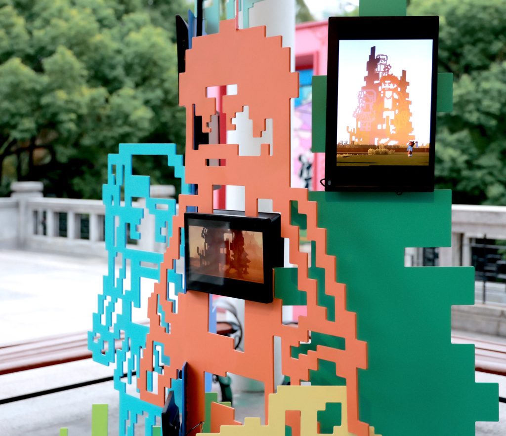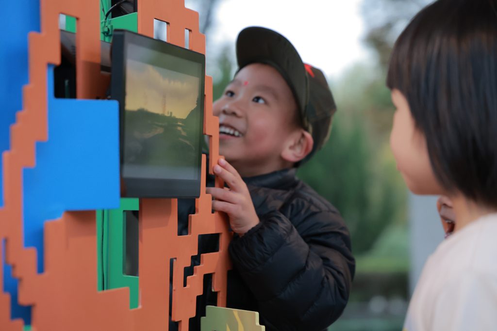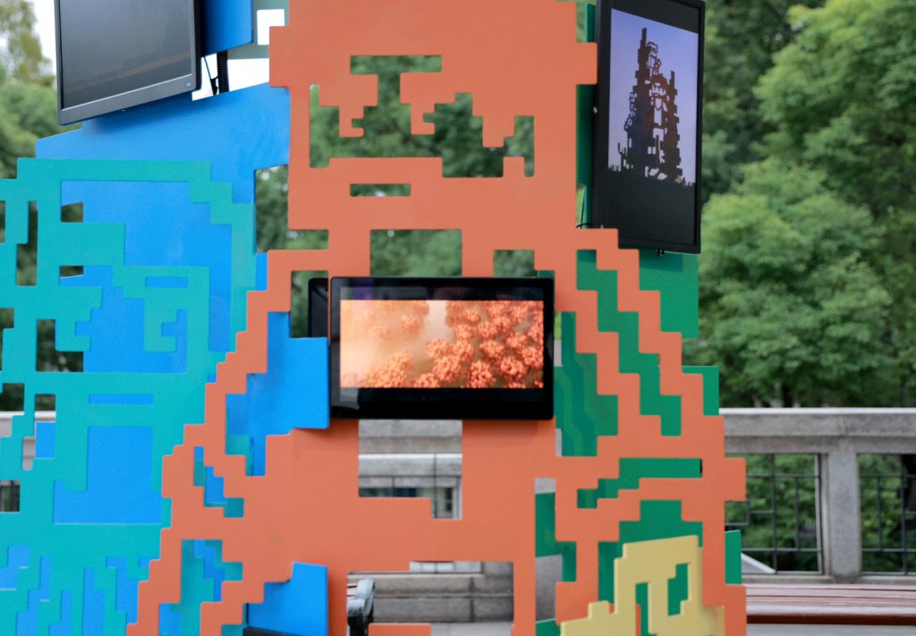 《像素公园》以虚拟数字世界的基本元素——像素,模拟真实世界中的人、树、草、花,将万物凝练为方块的轮廓。几块屏幕嵌入作品之间,轮播着公众共创与AI生成的像素图案,让屏幕艺术成为数字时代公众参与创作的新界面。